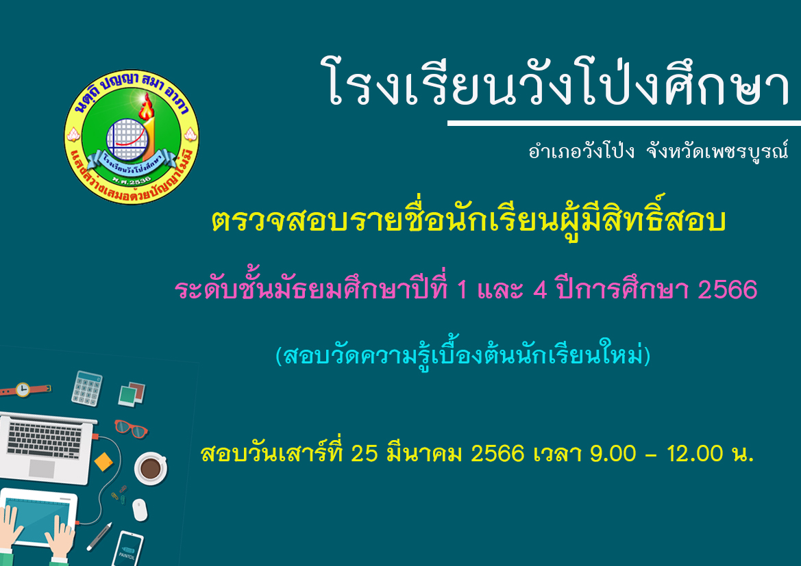 27 มี.ค. 2567 : ประกาศโรงเรียนวังโป่งศึกษา เรื่อง รายชื่อนักเรียนชั้นมัธยมศึกษาปีที่ 3 และ 6 ที่สำเร็จการศึกษาขั้นพื้นฐาน ตามหลักสูตรแกนกลางการศึกษาขั้นพื้นฐาน ปีการศึกษา 2566 ( อ่าน 2446 ครั้ง )