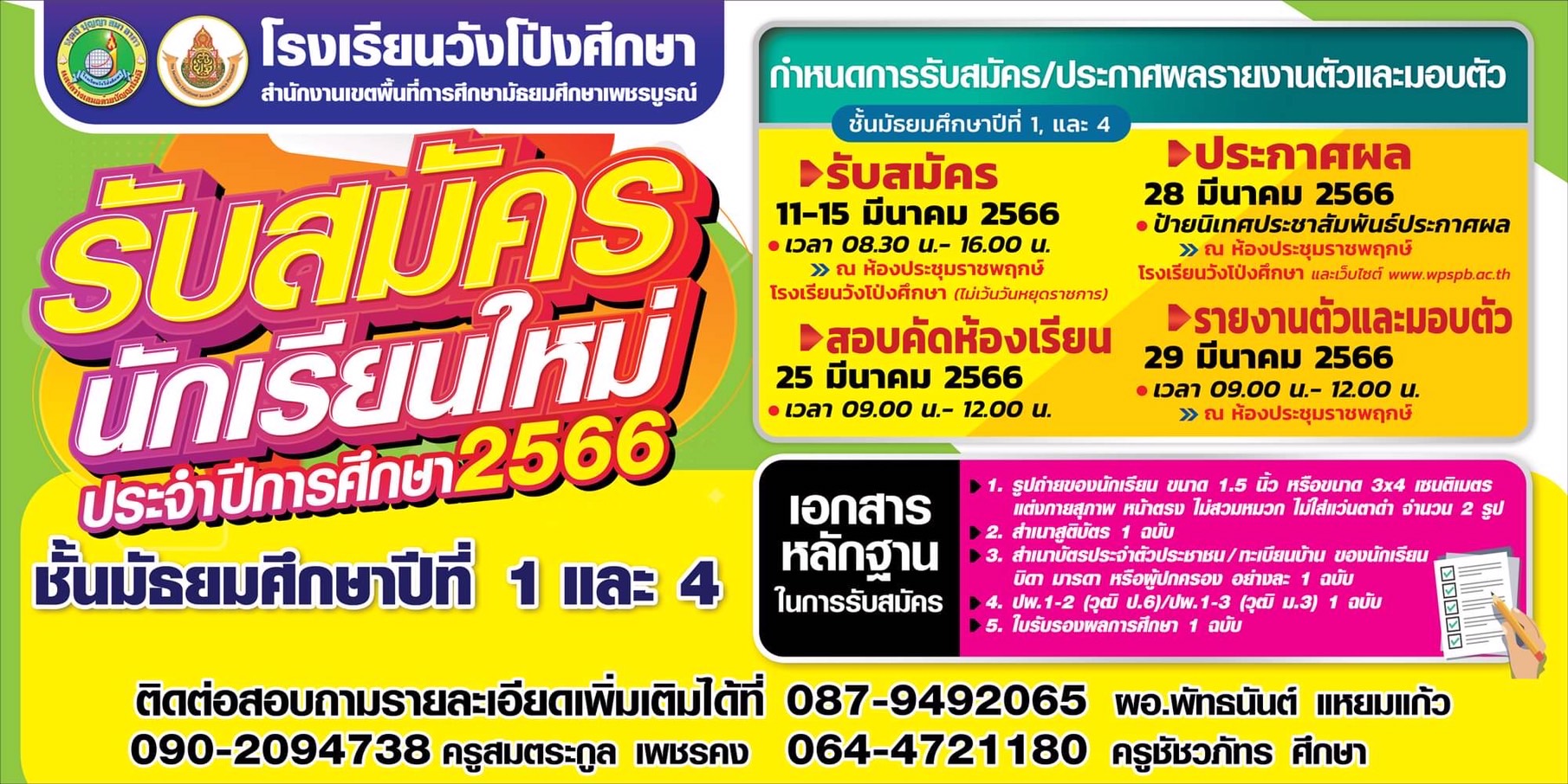 7 พ.ค. 2567 : ประกาศเปิดภาคเรียน โรงเรียนวังโป่งศึกษา ภาคเรียนที่ 1 ปีการศึกษา 2567 ( อ่าน 2437 ครั้ง )