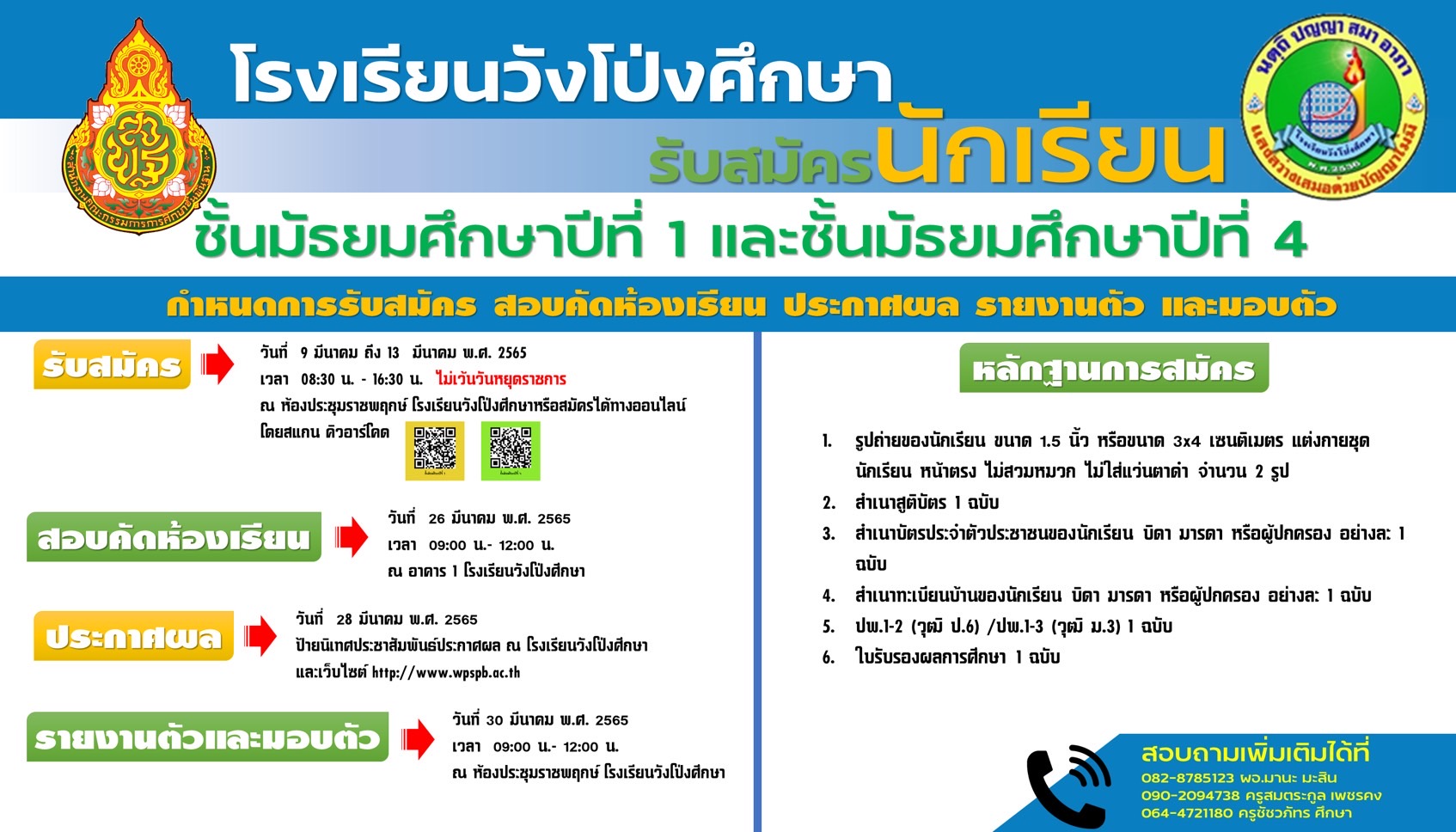 4 เม.ย. 2566 : งานทะเบียนโรงเรียนวังโป่งศึกษา ประกาศเลขประจำตัวนักเรียนชั้น ม.1 และ ม.4 ปีการศึกษา 2566 ( อ่าน 2443 ครั้ง )